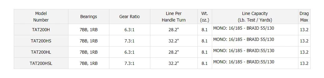 The Tatula 200 TWS is available in Standard (6.3:1) and High Speed (7.3:1) gear ratios in Right or Left Hand crank.